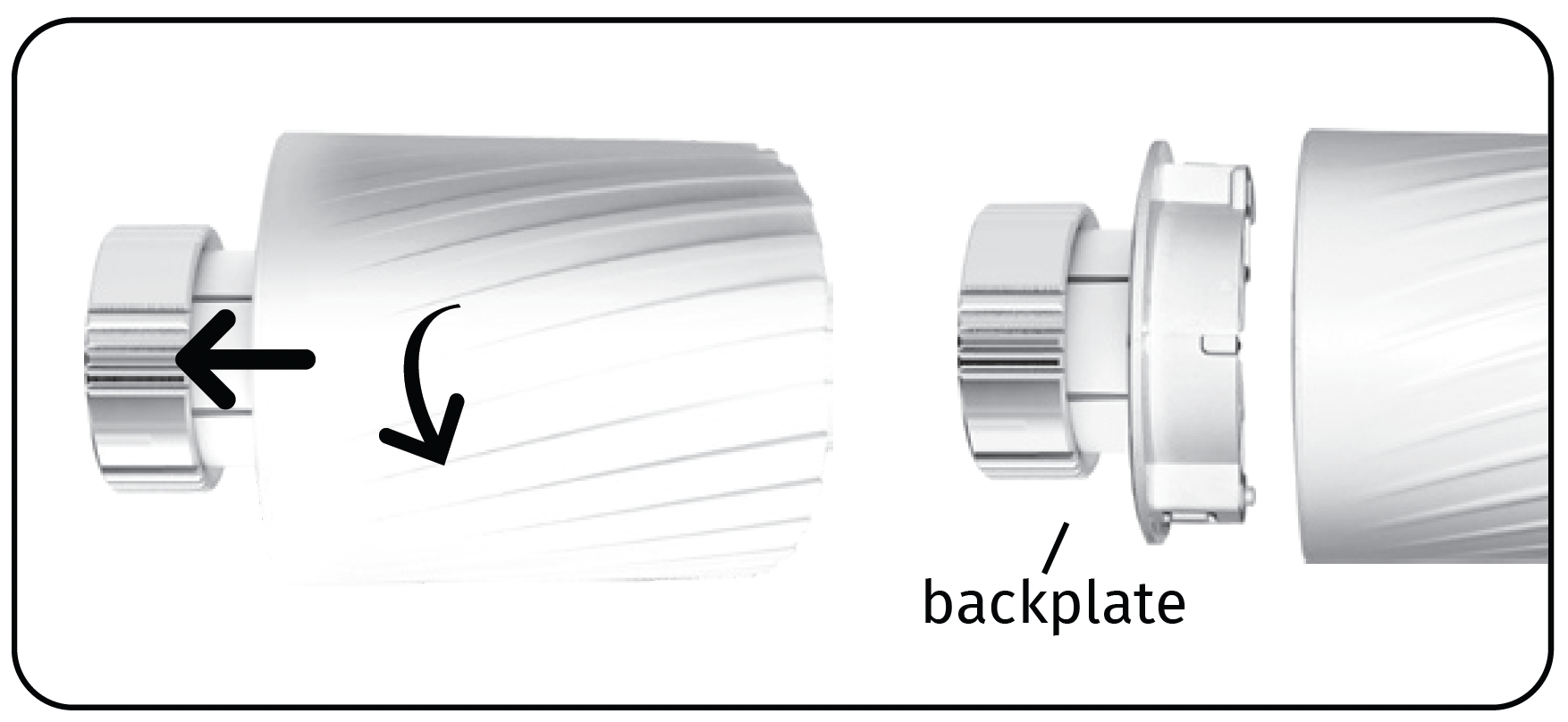 - Das Ventil mit moderater Kraft andrücken und im Uhrzeigersinn drehen um es auf der Rückplatte einrasten zu lassen